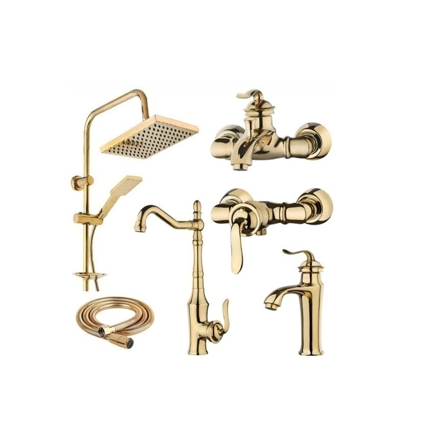 ست شش تیکه شیرآلات تیرداد مدل بامبو طلایی با روشویی پایه کوتاه به همراه دوش دو کاره و شیلنگ توالت