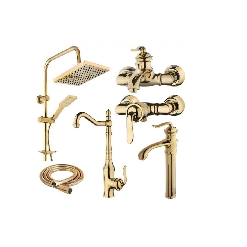 ست شش تیکه شیرآلات تیرداد مدل بامبو طلایی با روشویی پایه بلند به همراه دوش دو کاره و شیلنگ توالت