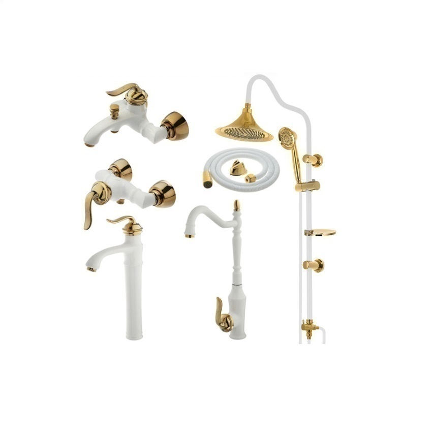 ست شش تیکه شیرآلات تیرداد مدل بامبو سفید طلایی با روشویی پایه بلند به همراه دوش دو کاره و شیلنگ توالت