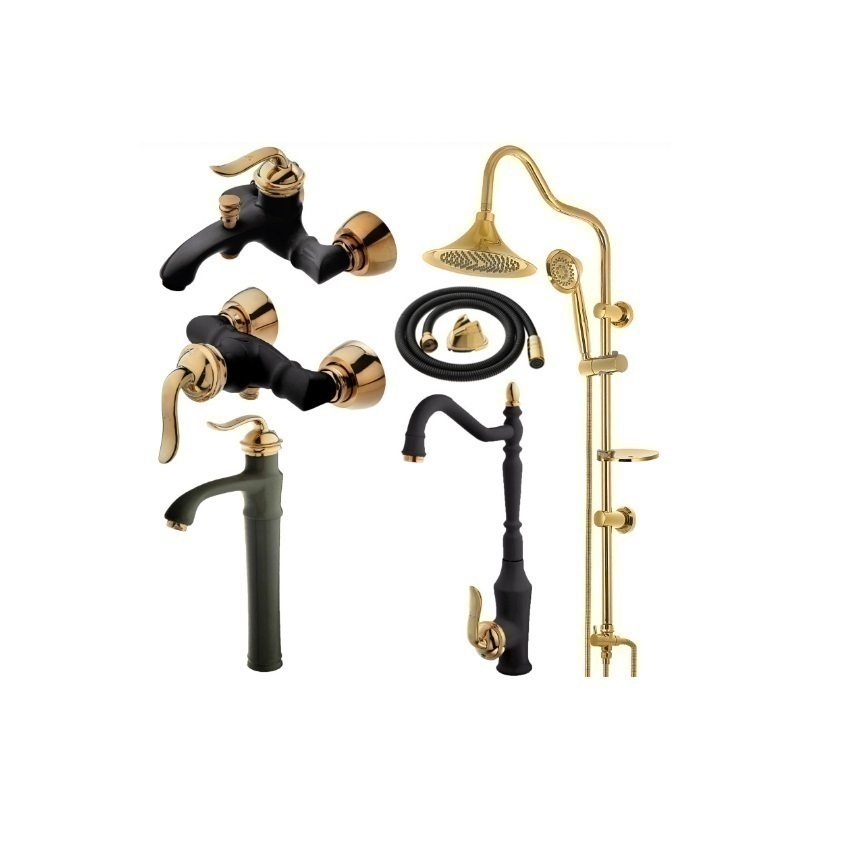 ست شش تیکه شیرآلات تیرداد مدل بامبو مشکی طلایی با روشویی پایه بلند به همراه دوش دو کاره و شیلنگ توالت
