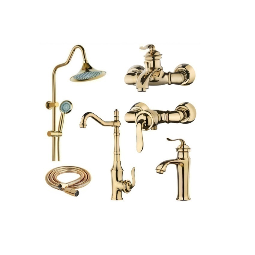 ست شش تیکه شیرآلات تیرداد مدل بامبو طلایی با روشویی پایه کوتاه به همراه دوش دو کاره و شیلنگ توالت